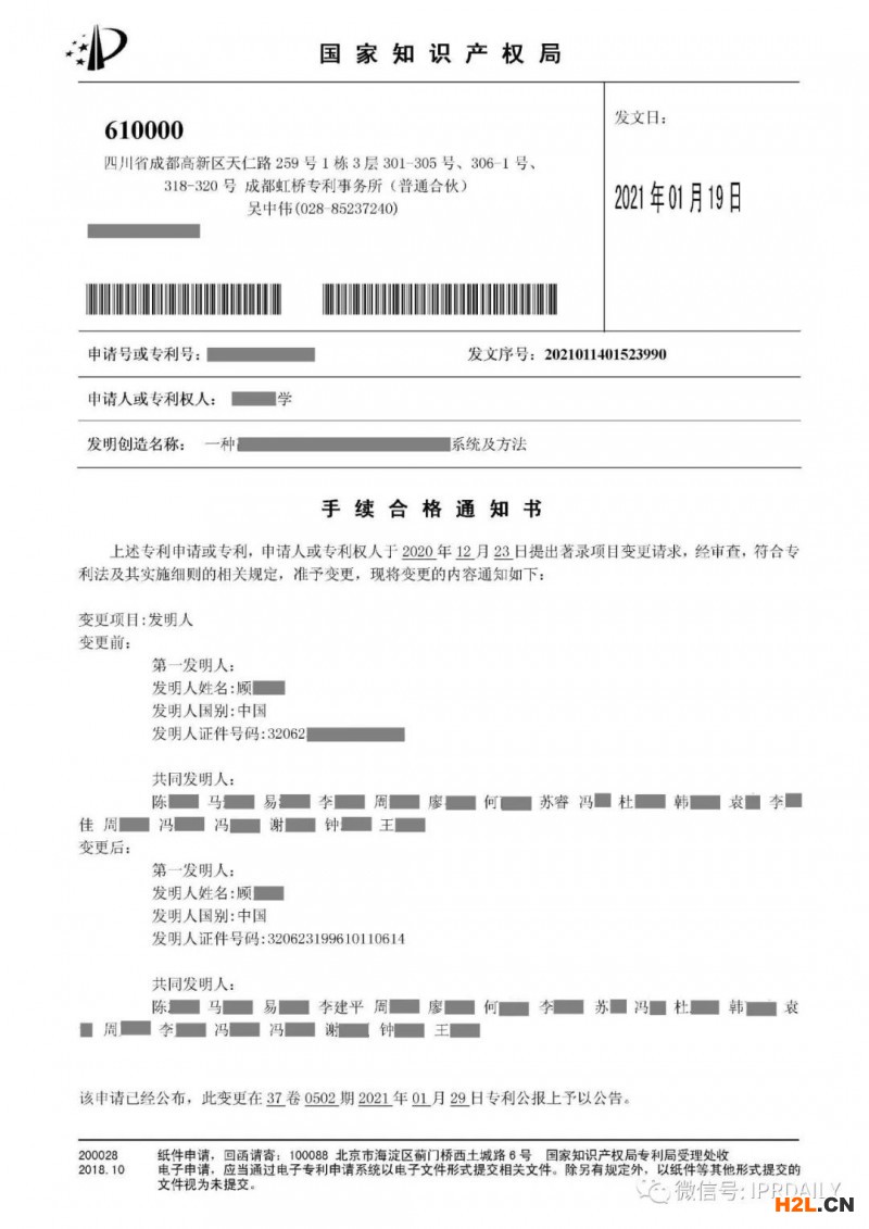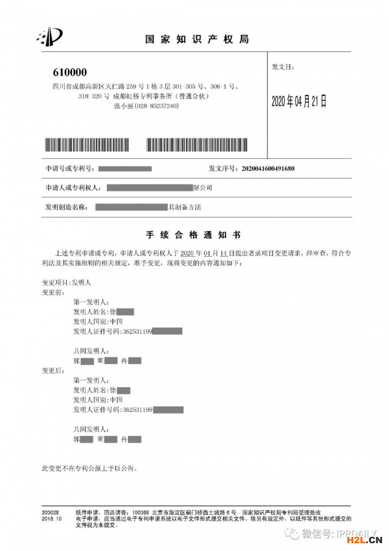 (3)對(duì)于刪除發(fā)明人應(yīng)提供“全部發(fā)明人身份證正、反面復(fù)印件或者清晰的掃描件/照片”,實(shí)際情況中大部分審查員在審批時(shí)是這樣要求的,但有時(shí)會(huì)遇到涉及的發(fā)明人數(shù)量較多,或者發(fā)明人離職等原因聯(lián)系不上,提供全部發(fā)明人的身份證確實(shí)比較困難。此時(shí)可僅提供刪除的發(fā)明人身份證或者可盡可能多的提供發(fā)明人身份證給審查員,若審查員下發(fā)《視為未提出通知書》指出必須提供全部發(fā)明人身份證憑證時(shí),再進(jìn)行補(bǔ)充。但這樣做或延長(zhǎng)審批獲得《手續(xù)合格通知書》的時(shí)間,請(qǐng)申請(qǐng)人慎重考慮。