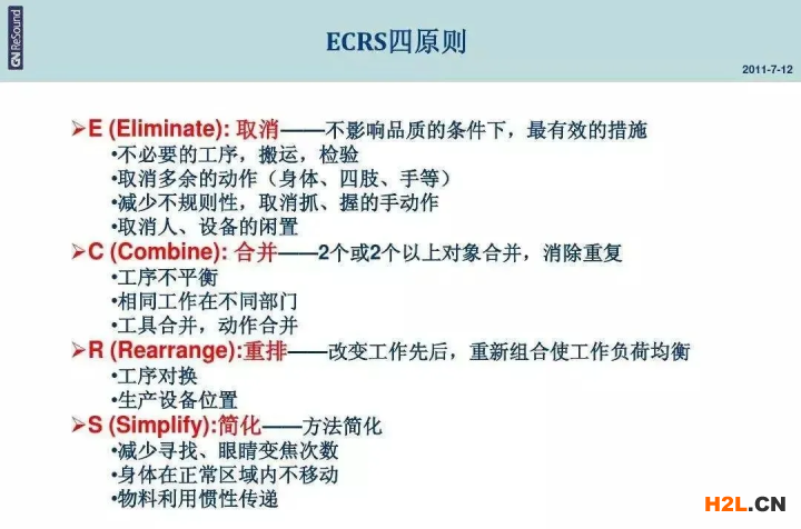 ECRS分析法其實是取消ELIMINATE,合并COMBINE,調(diào)整順序REARRANGE。簡化SIMPLIFU的一個縮寫形式。