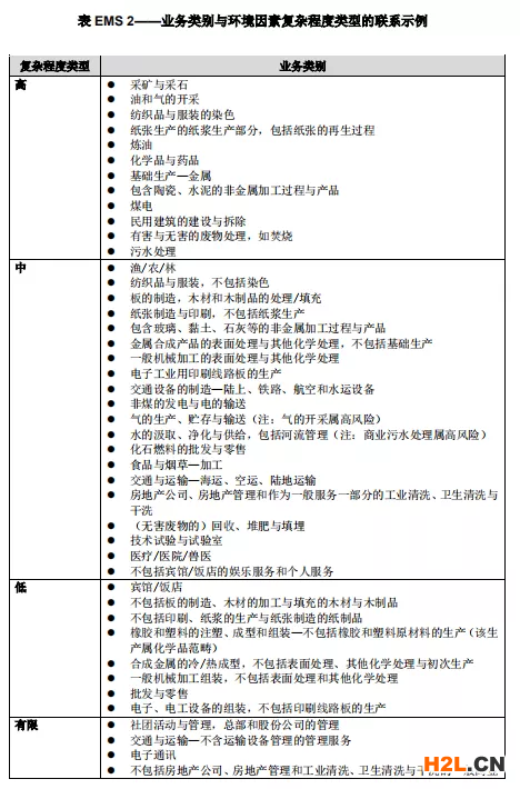表 EMS 2 將上述 5 種復(fù)雜程度類型與每種類型所覆蓋的典型行業(yè)做了對(duì)照。認(rèn)證機(jī)構(gòu)宜認(rèn)識(shí)到,在一個(gè)特定行業(yè)中,并不是所有組織都屬于相同的復(fù)雜程度類型。認(rèn)證機(jī)構(gòu)的申請(qǐng)?jiān)u審程序宜具有一定的靈活性,以確保在確定組織的復(fù)雜程度類型時(shí)考慮該組織的具體活動(dòng)。
