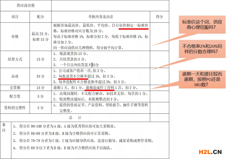 1、細(xì)化考核目標(biāo),比如交期的考核,要做到上述的考核細(xì)節(jié)和維度,盡量不使用打分制,因為初期考核的目的是改善,給供應(yīng)商扔個分?jǐn)?shù),供應(yīng)商無法有效改善。
