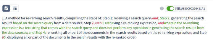 這件中國專利在授權(quán)的權(quán)利要求1中主要改變了兩個特征,一是增加了“其中重排序表達(dá)式與搜索表達(dá)式同時輸入”,二是刪除了對部分文檔進(jìn)行排序和顯示部分文檔的技術(shù)方案(根據(jù)重排序表達(dá)式,對部分文檔進(jìn)行重排序,以所述排序來顯示所述搜索結(jié)果中的部分文檔),只保留了對所有文檔進(jìn)行排序并顯示所有文檔的技術(shù)方案。