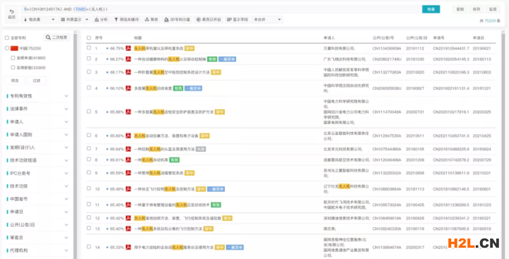 單獨使用布爾檢索式(TIABC=(無人機))檢索,與布爾+語義的檢索結(jié)果相同,也是75229件專利,但檢索結(jié)果中無相關(guān)度百分比,排序發(fā)生了變化。