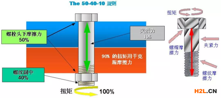 參見圖A:通常情況下,在螺栓的擰緊過程中,實際轉(zhuǎn)化為螺栓夾緊力的扭矩僅占10%,其余50%用于克服螺栓頭下的摩擦力,40%用于克服螺紋副中的摩擦力,這就是“541”規(guī)則,主要反映夾緊力與摩擦力之間的關(guān)系。
