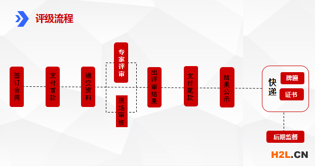 評級申請》簽訂合同》遞交材料》專家評審》出評審結(jié)果》結(jié)果公示》證書、牌匾、報告出具并快遞