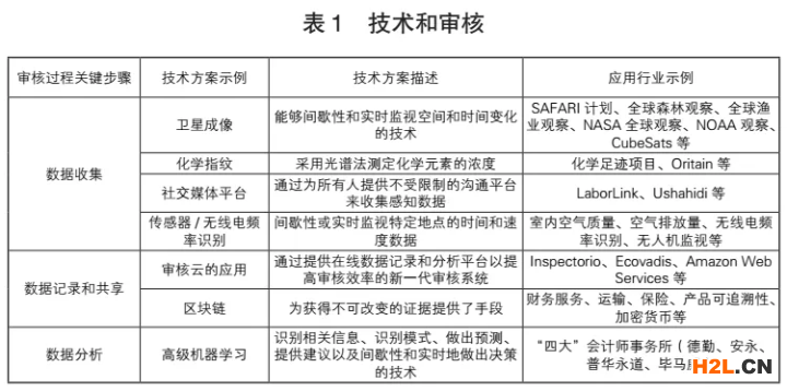 人工智能審核的核心就是數(shù)據(jù)管理 。更具體來講,就是管理數(shù)據(jù)收集、數(shù)據(jù)記錄、數(shù)據(jù)共享以及數(shù)據(jù)分析。對此,有多種技術(shù)可以提供相應的幫助。我們最近發(fā)表在《清潔生產(chǎn)》雜志的一篇文章,創(chuàng)造了“技術(shù)增強型審核(TEA)”這一術(shù)語,以此來探討如何通過采用新的技術(shù)來增強對數(shù)據(jù)的管理。對此,我們還提供了許多示例(見表 1)。例如,衛(wèi)星成像可以通過間歇性或?qū)崟r監(jiān)視空間和時間方面的變化(例如在森林植被或捕魚作業(yè)中)來支持數(shù)據(jù)收集過程。
