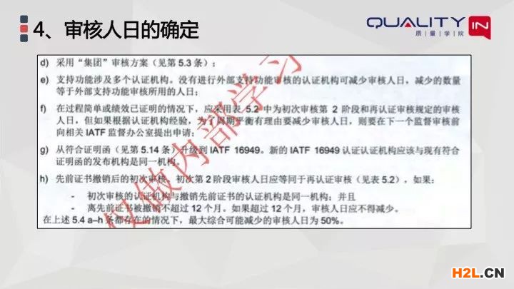 也就是說(shuō)你這個(gè)是從VDA6.1或者ISO9001升級(jí),升級(jí)成16949.那我們可以只用一半的審核人天就可以了。但是大家注意,這個(gè)升級(jí)也要滿足一定的條件,比如說(shuō)范圍必須跟ISO9001或者VDA6.1是一致的。