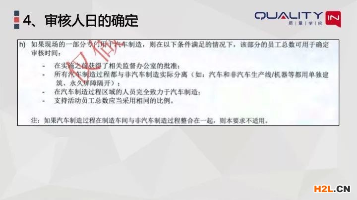 大家看一下認(rèn)可規(guī)則里邊h)的這一條。那只有這些情況滿足了,你才能夠只申報(bào)專門用于汽車產(chǎn)品生產(chǎn)的這些人數(shù)來(lái)計(jì)算審核人天,如果不能滿足這些條件,那你只能跟生產(chǎn)非汽車產(chǎn)品的這些員工一起來(lái)報(bào)。