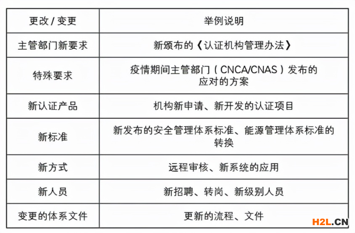 對(duì)組織管理體系有影響的任何更改,尤其關(guān)注新的法規(guī)要求、標(biāo)準(zhǔn)變更、認(rèn)證規(guī)則更新、新技術(shù)、新方法應(yīng)用等;