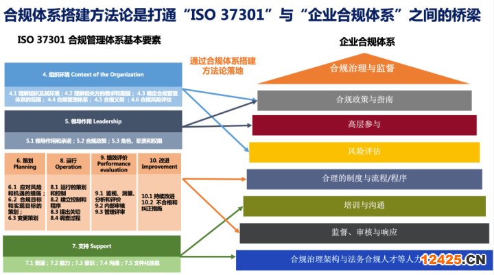 我們了解到,權威的第三方認證機構在對企業(yè)進行ISO 37301認證時,并非機械地對企業(yè)合規(guī)管理模塊、流程進行單點打分,而是基于ISO 37301的要求,依照 ISO19011《管理體系審核指南》以及機構的認證管理規(guī)則,以一種系統(tǒng)性的過程評審方式進行。這對企業(yè)的啟發(fā)是:要獲得ISO 37301認證,企業(yè)需要通過有效的方法論,并結合企業(yè)實際情況,實施ISO 37301.以銜接ISO 37301的標準要求與企業(yè)的合規(guī)體系(如下圖所示),實現企業(yè)合規(guī)體系與ISO 37301適配。接下來,我將結合我在世界500強跨國企業(yè)擔任法律合規(guī)負責人期間的合規(guī)實操經驗,分享企業(yè)應如何搭建出符合ISO 37301國際水準的合規(guī)管理體系。