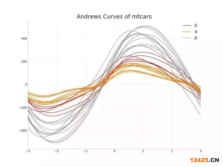 49. 安德魯斯曲線 (Andrews Curve) 安德魯斯曲線有助于可視化是否存在基于給定分組的數(shù)字特征的固有分組。 如果要素(數(shù)據(jù)集中的列)無法區(qū)分組(cyl),那么這些線將不會(huì)很好地隔離,如下所示。