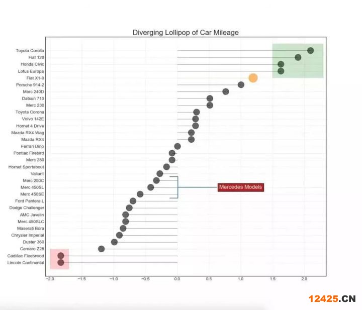 13. 帶標(biāo)記的發(fā)散型棒棒糖圖 (Diverging Lollipop Chart with Markers) 帶標(biāo)記的棒棒糖圖通過強(qiáng)調(diào)您想要引起注意的任何重要數(shù)據(jù)點(diǎn)并在圖表中適當(dāng)?shù)亟o出推理,提供了一種對(duì)差異進(jìn)行可視化的靈活方式。