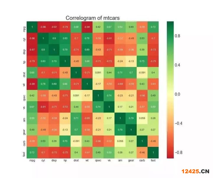 8. 相關(guān)圖 (Correllogram) 相關(guān)圖用于直觀地查看給定數(shù)據(jù)框(或二維數(shù)組)中所有可能的數(shù)值變量對(duì)之間的相關(guān)度量。