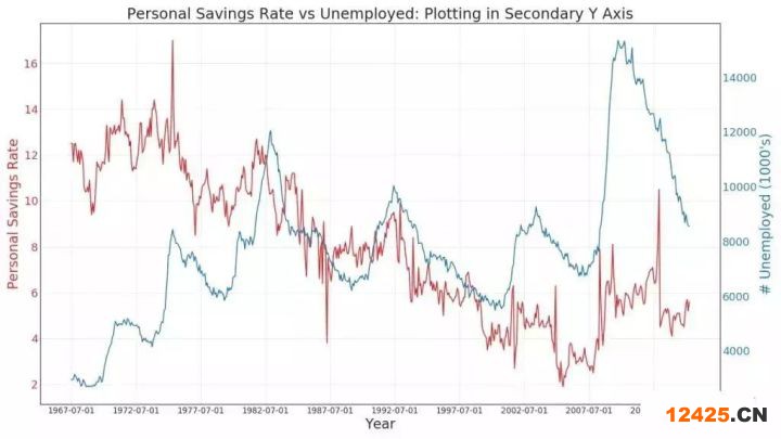 44. 未堆積的面積圖 (Area Chart UnStacked) 未堆積面積圖用于可視化兩個(gè)或更多個(gè)系列相對(duì)于彼此的進(jìn)度(起伏)。 在下面的圖表中,您可以清楚地看到隨著失業(yè)中位數(shù)持續(xù)時(shí)間的增加,個(gè)人儲(chǔ)蓄率會(huì)下降。 未堆積面積圖表很好地展示了這種現(xiàn)象。