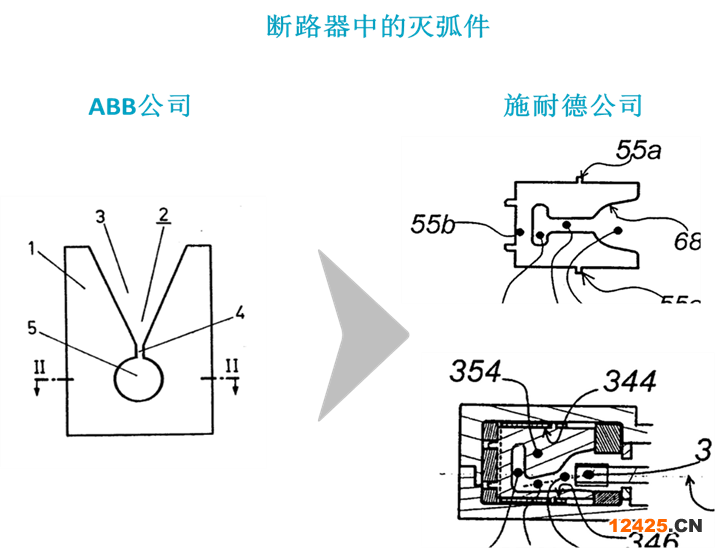 例如施耐德公司,將ABB公司已有專利中,入口處V型的結(jié)構(gòu)替代為錐形結(jié)構(gòu),將U型結(jié)構(gòu)替代為拉長型結(jié)構(gòu)。