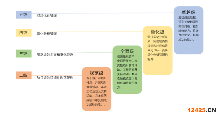 成熟度模型分為五個(gè)等級(jí),一級(jí)為初始級(jí),二級(jí)為規(guī)范級(jí),三級(jí)為全面級(jí),四級(jí)為量化級(jí),五級(jí)為卓越級(jí)。其中五級(jí)最高,每一等級(jí)是實(shí)現(xiàn)下一個(gè)等級(jí)的基礎(chǔ),實(shí)現(xiàn)分級(jí)遞進(jìn)。并約定通過GJB9000質(zhì)量管理體系認(rèn)證的組織,其軟件能力成熟度為一級(jí)。二級(jí)及以上等級(jí),均以通過GJB5000相應(yīng)等級(jí)評(píng)價(jià)為依據(jù)。