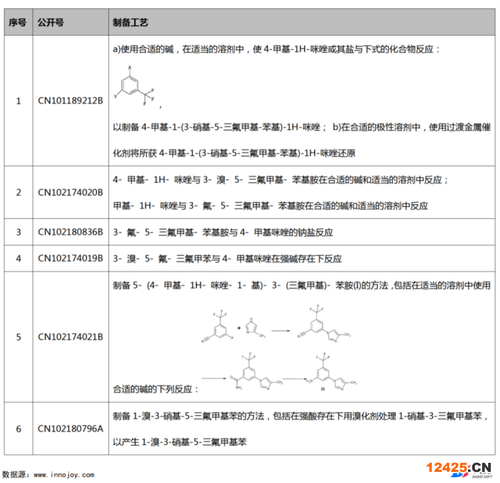 尼洛替尼作為伊馬替尼的升級產(chǎn)品,與伊馬替尼的母核結(jié)構(gòu)相似,僅將伊馬替尼結(jié)構(gòu)中的N-甲基哌嗪改變?yōu)槿谆瓦溥蛉〈谋交VZ華制藥針對此處改進(jìn)申請了中間體及其制備方法專利進(jìn)行重點(diǎn)保護(hù),對應(yīng)的PCT專利為WO2006135640A2.其獨(dú)權(quán)1主要保護(hù)的是5-(4-甲基-1H-咪唑-1-基)-3-(三氟甲基)-苯胺(中間體1