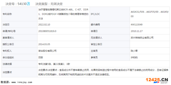 特瑞藥業(yè)于2023年9月14日針對諾華制藥登記的CN1324022C(基礎(chǔ)化合物)專利進(jìn)行了3類聲明,并針對CN101228151B(衍生物)和CN102612368B(用途)專利進(jìn)行了4.1類聲明。同時(shí)特瑞藥業(yè)已經(jīng)于2023年9月16日,分別對專利CN101228151B和CN102612368B提出了無效請求,根據(jù)專利復(fù)審委員會作出的無效宣告請求審查決定書,CN101228151B(CN200680026444.6)被宣告全部無效,CN102612368B(CN201080051819.0)維持專利權(quán)有效,對應(yīng)的無效決定如下。