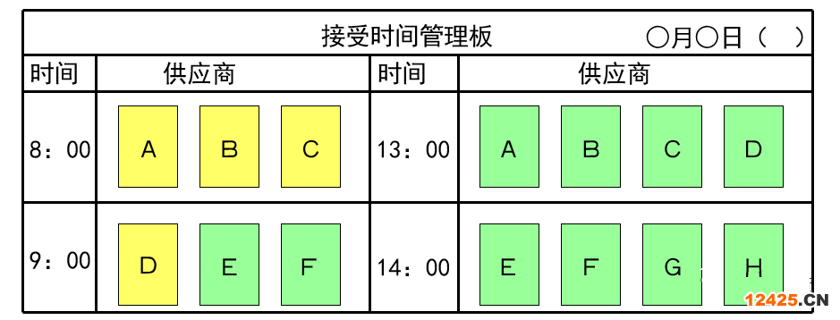 外注品納入時(shí),如果按照外注的時(shí)間納入,接受一方的工作就會(huì)發(fā)生不均衡,所以決定納入時(shí)間帶,每個(gè)納入時(shí)間帶,為了明白哪個(gè)廠家納入而記入在懸掛板上,這個(gè)欄目上,納入前和納入后要進(jìn)行顏色區(qū)分,納入廠家,用納入時(shí)間點(diǎn)反過來制作結(jié)構(gòu)。是否納入,根據(jù)管理板就能看出。