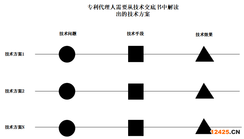 請(qǐng)參見(jiàn)圖2.專利代理人基于對(duì)專利申請(qǐng)的認(rèn)知,需要從發(fā)明人提供的技術(shù)交底書(shū)的文字記載中解析出至少一個(gè)技術(shù)方案,例如,技術(shù)方案1、技術(shù)方案2和技術(shù)方案N等。專利代理人認(rèn)為的完整的技術(shù)方案應(yīng)該是結(jié)構(gòu)化的呈現(xiàn),即至少包括兩部分:完整的組成要素和準(zhǔn)確的邏輯關(guān)系。其中,完整的組成要素至少需包括技術(shù)方案所解決的技術(shù)問(wèn)題、所采用的技術(shù)手段和所獲得的技術(shù)效果(分別對(duì)應(yīng)圖2中的圓形、四邊形和三角形)三方面的內(nèi)容,缺一不可。準(zhǔn)確的邏輯關(guān)系還需包括各個(gè)組成要素之間相互匹配的對(duì)應(yīng)關(guān)系(圖2中的實(shí)線),各個(gè)組成要素之間有嚴(yán)密的邏輯推理關(guān)系。