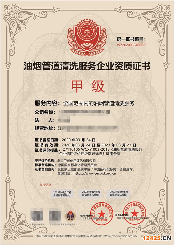 油煙管道清洗服務(wù)企業(yè)資質(zhì)證書