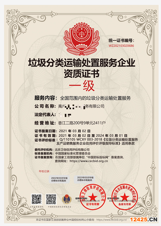 垃圾分類運(yùn)輸處置服務(wù) 企業(yè)資質(zhì)證書