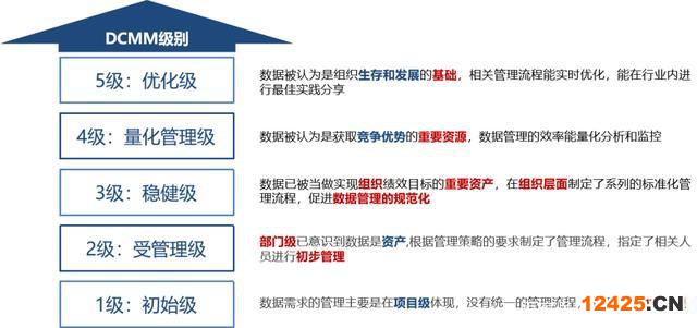 DCMM將數(shù)據(jù)管理能力成熟度劃分為五個等級,自低向高依次為初始級(1級)、受管理級(2級)、穩(wěn)健級(3級)、量化管理級(4級)和優(yōu)化級(5級),不同等級代表企業(yè)數(shù)據(jù)管理和應用的成熟度水平不同。