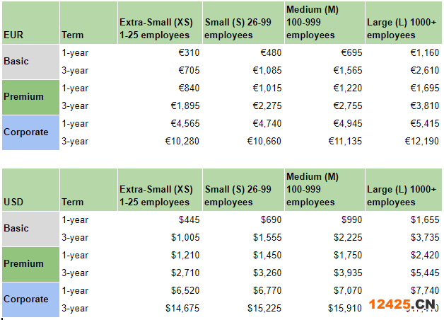 EcoVadis審核平臺(tái)根據(jù)被評(píng)估公司的規(guī)模來確定收費(fèi)標(biāo)準(zhǔn)。公司規(guī)模越大,收費(fèi)標(biāo)準(zhǔn)越高。收費(fèi)期按一年和三年收取。收費(fèi)貨幣僅支持歐元和美元。詳細(xì)的收費(fèi)標(biāo)準(zhǔn)請(qǐng)查看下圖: