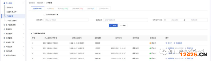 訂單管理頁面可以查詢、查看、下載訂單,待支付的訂單可點(diǎn)擊去支付跳轉(zhuǎn)到支付界面進(jìn)行支付,支付失敗的訂單可以重新生成,已開具電子票據(jù)的訂單可以查看并獲取對(duì)應(yīng)的電子票據(jù)。