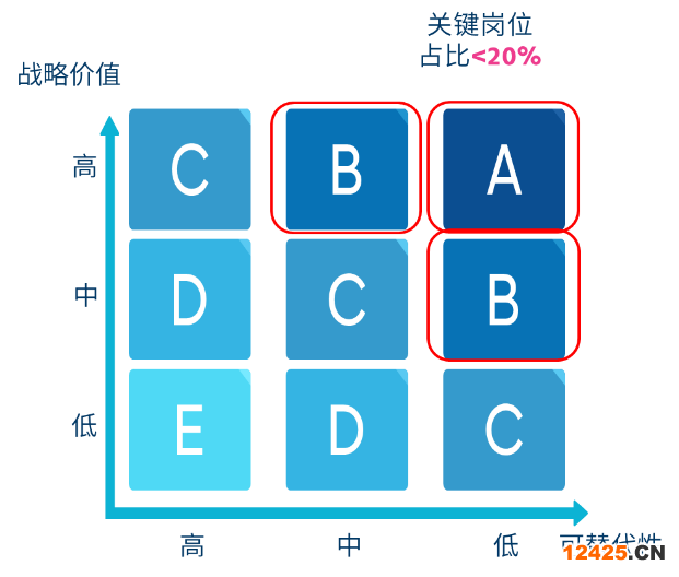 戰(zhàn)略價值越高且可替代性越低,則崗位的關(guān)鍵性越高,比如坐標中的A類崗位。關(guān)鍵程度其次的就是排列在坐標中的B類崗位。企業(yè)一般會在綜合排序后,把處在A類和B類的統(tǒng)稱為關(guān)鍵崗位,并且會將該類崗位占全部崗位的比例限制在20%以內(nèi)。