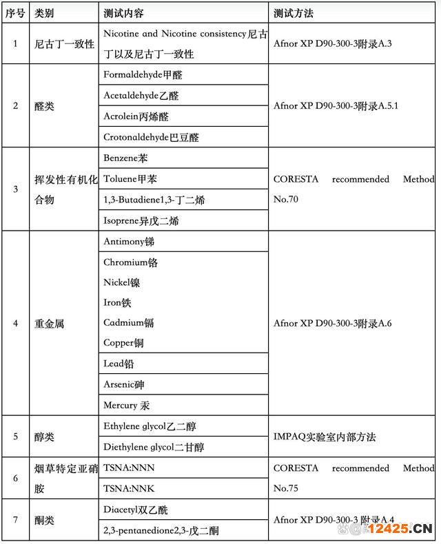 具體的檢測(cè)認(rèn)證項(xiàng)目包括尼古丁及一致性、羰基化合物、重金屬、酮類、醇類、煙草中特有亞硝胺、揮發(fā)揮性有機(jī)物等,見下表1.