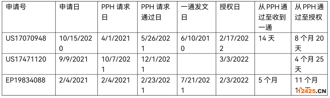 案例3.歐洲發(fā)明專利申請(qǐng),EP19834088.從2/4/2021提交至歐洲專利局同時(shí)提交PPH請(qǐng)求,從申請(qǐng)至授權(quán)總計(jì)約11個(gè)月10天,從申請(qǐng)至收到第一次審查意見(jiàn)約5個(gè)月。