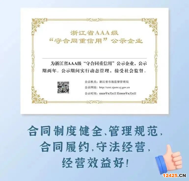 1.浙江省AA級“守合同重信用”企業(yè)連續(xù)公示滿二年;