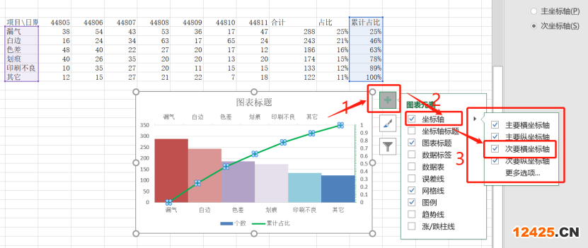 步驟3:點(diǎn)擊圖表,選擇“累計(jì)占比”系列,將其繪制在“次坐標(biāo)軸”。