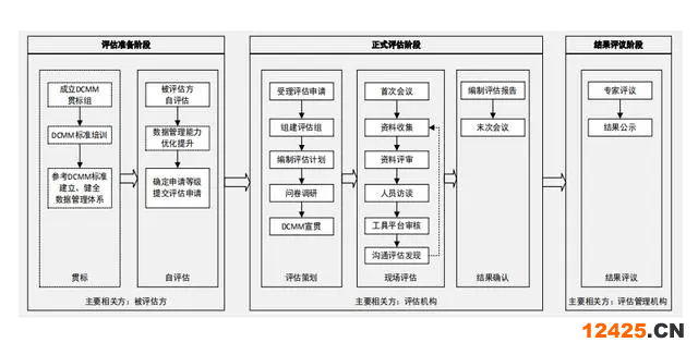 想要獲得DCMM認(rèn)證,企業(yè)還需要深入了解DCMM認(rèn)證的評估流程。通常來說,DCMM評估流程具體分為評估準(zhǔn)備、正式評估、結(jié)果評議三階段。