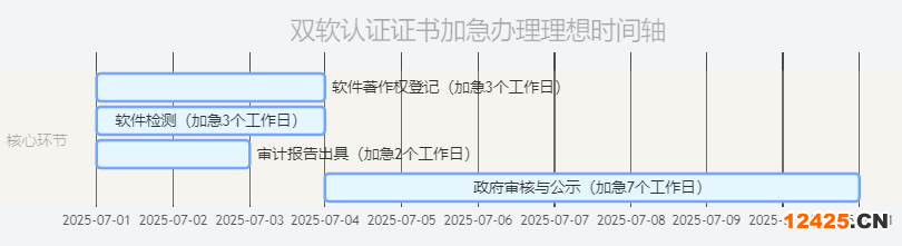 通過合理規(guī)劃各環(huán)節(jié)并行操作,企業(yè)最快可在15 個(gè)工作日完成雙軟認(rèn)證證書加急辦理,理想時(shí)間規(guī)劃路徑如下: